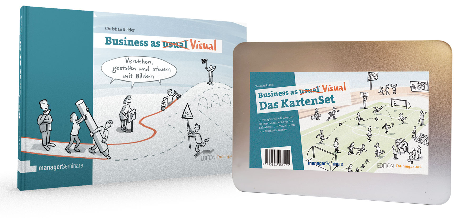 Christian Ridder: Business as Visual Doppelpack – Buch und KartenSet. managerSeminare, Bonn 2021. Methodenbuch 240 S., kt., und KartenSet aus 50 Karten auf strapazierfähigem Karton, zusammen zum Kombinationspreis 69,90 Euro ab Verlag.