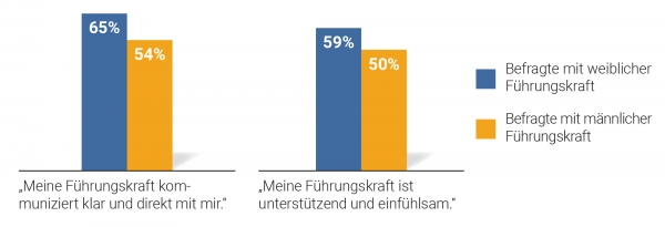 Demnach sind 31 Prozent der Befragten mit ihrer aktuellen Führungskraft im Unternehmen sehr zufrieden; dieser Anteil steigt bei Mitarbeitenden mit weiblichen Führungskräften auf 39 Prozent. Ein möglicher Grund dafür liegt laut Studienergebnissen in unterschiedlichen Kommunikationsstilen: 65 Prozent der Befragten mit weiblicher Führungskraft sagen, dass ihre Führungskraft klar und direkt mit ihnen kommuniziert, und 59 Prozent loben ihren unterstützenden und einfühlsamen Stil. Bei den Befragten mit männlichen Führungskräften liegen die Werte in diesen Kategorien bei 54 bzw. 50 Prozent.