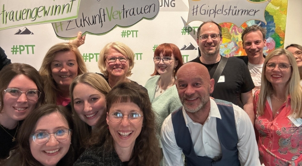 Gipfelstürmer und -stürmerinnen mit Zukunftsvertrauen: Das Team von managerSeminare beim Selfie-Versuch.