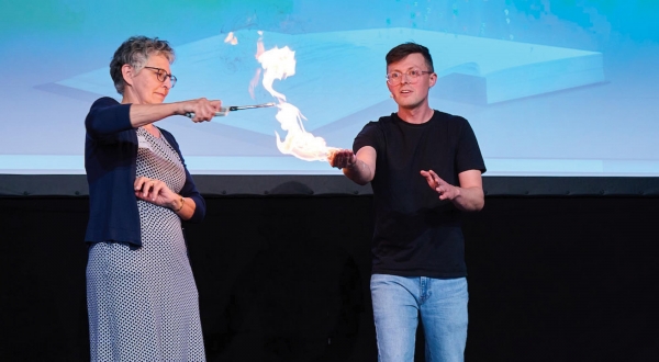 Feuer und Flamme für Experimente: Science Influencer Jacob Beautemps lässt sich von einer Freiwilligen aus dem Publikum anzünden.
