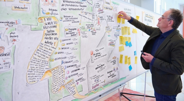 Eingeführt wird der Begriff von Keynote Speaker Eric Eller. Der Professor für Wirtschafts- und Medienpsychologie an der TU Ingolstadt hat zum Thema Vertrauen promoviert. „Vertrauen“, sagt Eller, „ist eine Entscheidung für Verletzlichkeit.“ Und zwar eine, die einen reziproken Mechanismus in Gang setzt: „Wer Vertrauen gibt, erhält es auch zurück.“ Diese Reziprozität ist nicht nur faszinierend, sondern dem Wissenschaftler zufolge auch unsere große Chance, weil sie zeigt: „Vertrauen ist kein Zufall, wir können es aktiv, bewusst und systematisch verändern.“ Und das heißt auch: Wir können in unseren Organisationen eine Vertrauensarchitektur und darüber eine Vertrauenskultur schaffen.