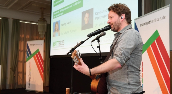 Lucas Heinz/managerSeminareAuch Abichts Beitrag zeigt: Die Zukunft ist offen. Wir haben es jetzt in der Hand, welche Stränge wir weiterverfolgen wollen – und wie. Und es lohnt sich immer, genau hinzusehen. Wir werden dann erkennen, dass die Entwicklung zum Positiven möglich ist, statt in lähmender Schwarzseherei zu versinken. Musiker Rudy Bax, der den PTT 2025 einen coolen Gitarrensound verpasst, stimmt nach Abichts Auftritt passenderweise „Wake Me Up“ von Avicii an.