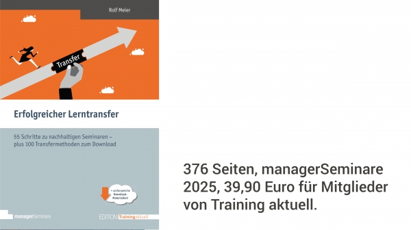 Bei Fachkursen empfiehlt er etwa klare Strukturierungsregeln für die Vermittlung von Spezialwissen – und stellt das Sandwich-Modell vor. Auch medialen Transferhilfen wie Skripten, Checklisten und Ablaufplänen widmet er genügend Raum. Abgerundet wird das Buch durch Hinweise zur Qualitätssicherung und Evaluation sowie durch Tipps zur Erhebung aussagekräftiger Daten.