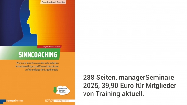 Übersicht AnsprechpartnerNach seinen beiden bisherigen Praxishandbüchern zum Werte- und Krisencoaching stellt der promovierte Philosoph Ralph Schlieper-Damrich nun seinen neuesten Coachingansatz vor: Sinncoaching. Dabei stützt er sich vornehmlich auf Viktor Frankls Logotherapie und die zugrunde liegenden philosophischen Denkschulen, insbesondere die Existenzphilosophie.