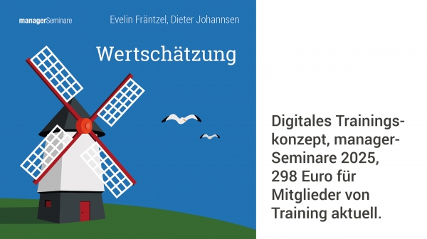 Übersicht AnsprechpartnerWertschätzung ist ein zentrales Thema für die Kommunikation und Zusammenarbeit in Teams und Unternehmen. Zu diesem wichtigen Thema haben Evelin Fräntzel und Dieter Johannsen ein Trainingskonzept entwickelt. Trainerinnen und Trainer können es beispielsweise mit Personalverantwortlichen, Teams, Mitarbeitenden mit Kundenkontakt oder auch mit Pflegekräften anwenden. Das klar strukturierte und optisch ansprechend aufbereitete Schulungsprogramm besteht aus PowerPoint-Präsentationen, umfangreichen Skripten für die Teilnehmenden, Arbeitsblättern, Übungen, Mustervorlagen und Beispielen für Flipcharts.