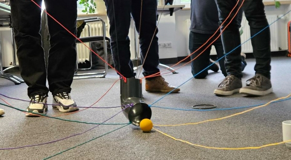 Nach einem kurzen Abklatschen und Feiern des Erfolges startet das Team in die nächste Runde. Wir erhöhen den Schwierigkeitsgrad und verkleinern das Ziel. Nun muss der Ball in einer Tasse platziert werden. Die Erfahrungen aus der ersten Runde zahlen sich schnell aus, und der Ball erreicht das Ziel erneut. Die Teilnehmenden wollen auch den dritten Ball ins Ziel bringen, und wir erhöhen erneut die Anforderungen, indem wir die Tasse auf einen umgedrehten Papierkorb stellen – auch das gelingt. Das Team zeigt nun sehr starke Leistungen und Zusammenhalt und möchte die Schwierigkeitsstufe noch weiter erhöhen. Es wird eine letzte Variante gespielt: Nur zwei Teilnehmende führen das Team, alle anderen schließen die Augen. An dieser Variation scheitert das Team letztlich, und erst durch einen „Joker“ – zwei weitere Augenpaare kommen dazu – wird das Team zum Erfolg geführt.