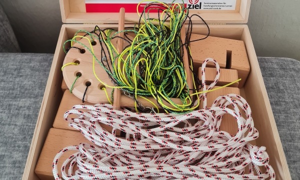 Teamspirit Lifter kommt in einem stabilen Holzkoffer daher. Im Lieferumfang enthalten sind sieben Holzklötze in unterschiedlichen Größen und Formen (die Flächen einiger Klötze sind gerade, einige schräg), ein hölzener Kran, an dem zwölf bunte Schnüre befestigt sind, ein langes Begrenzungsseil sowie eine kurze Anleitung. Das gesamte Set wirkt robust, ist jedoch aufgrund seines hohen Gewichts für den Transport ohne Auto eher unpraktisch.