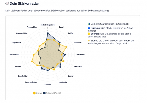 Wo liegen meine Stärken? Was gibt mir Energie, was kostet mich Energie? Die Applikation „Stärken Discovery“ der metaFox GmbH will eine erste Orientierung zu diesen Fragen liefern. Mithilfe von Selbst- und Fremdeinschätzungen zu einem Fragebogen aus 64 Fragen ermittelt die App Stärkenrollen sowie Denk- und Verhaltensweisen, die sich bei der jeweiligen Person am häufigsten zeigen. Die Auswertung enthält unter anderem einen Stärkenradar inklusive Definitionen verschiedener Stärkenrollen. Über diesen können die Ausprägungen von 16 Rollen, darunter beispielsweise Prüfer, Wächter, Umsetzer oder Motivator, eingesehen werden. Die Auswertung kann zum Beispiel im Karriere-Coaching, Leadership Coaching oder bei der Teamentwicklung eingesetzt werden. Das Tool ist kostenlos, erfordert jedoch eine Registrierung.